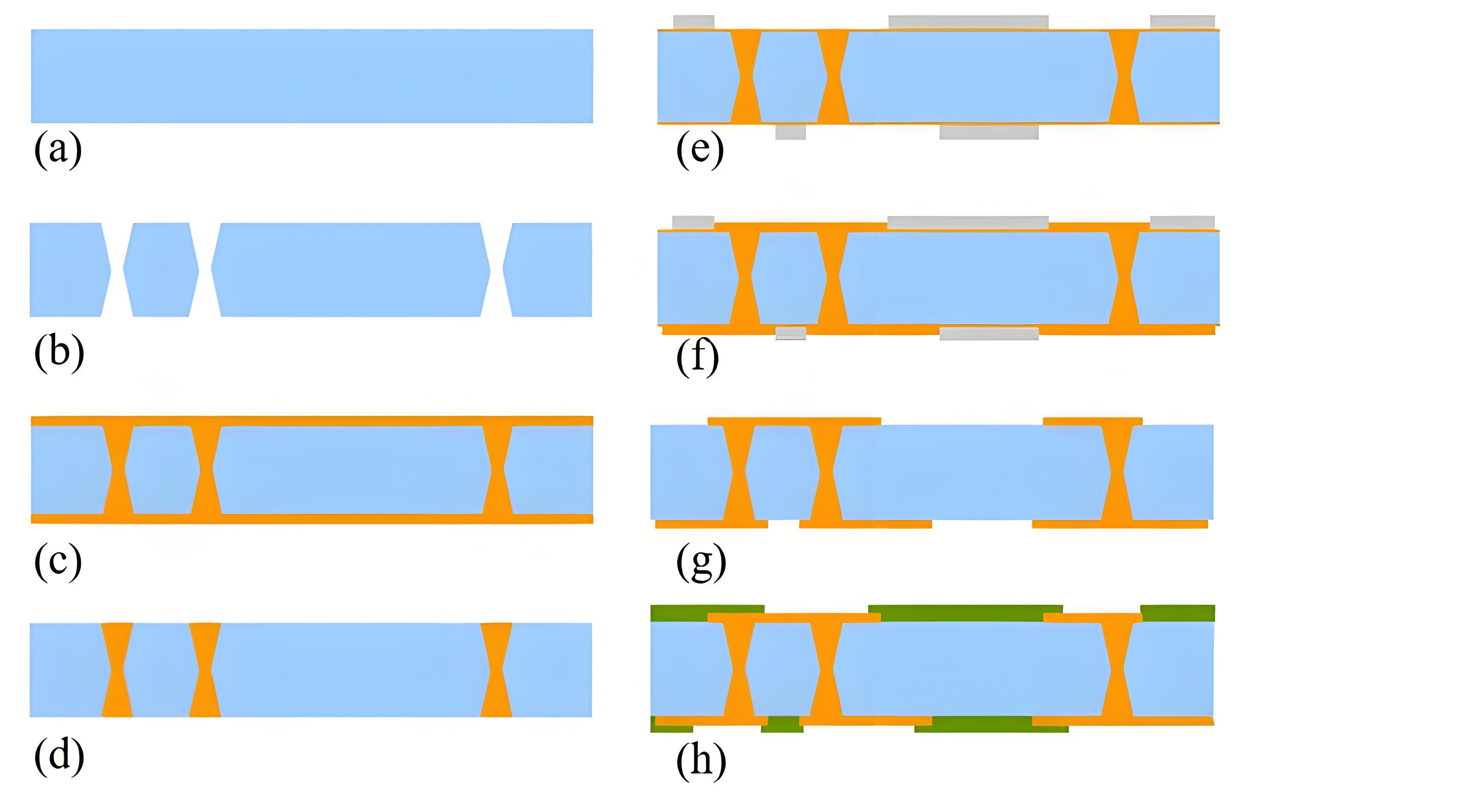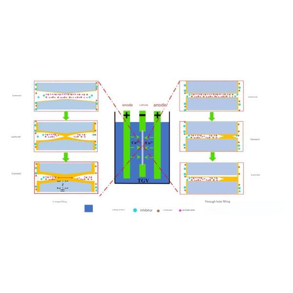 Finally, temporary bonding, back grinding, chemical mechanical polishing (CMP) to expose copper, debonding, and forming a through-glass via (TGV) process technology metal-filled transfer board. During the process, semiconductor processes such as cleaning and testing are also required.