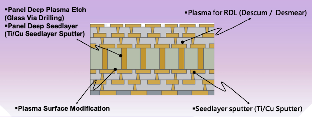 Through Glass Vias (TGVs) are fabricated using plasma etching technology.